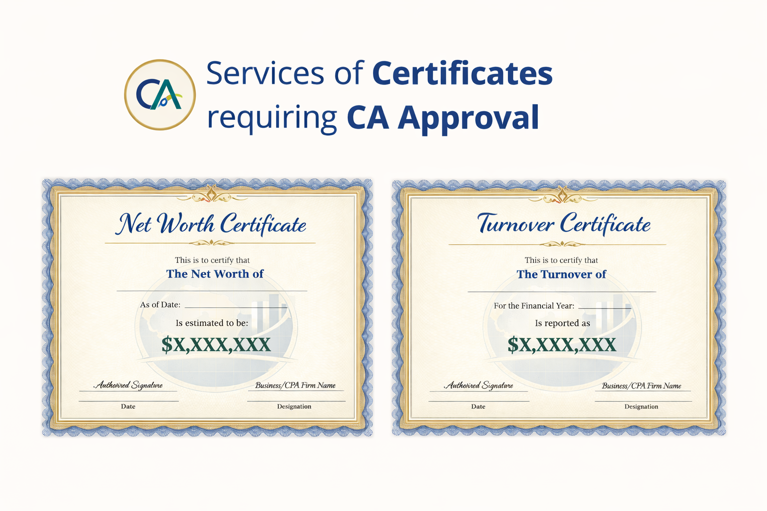 Our Certificates Requiring CA Approval service ensures accurate preparation, verification, and certification of documents as per applicable laws and professional standards. We handle the entire process — from reviewing your financial data to issuing CA-approved certificates — with complete accuracy and confidentiality.