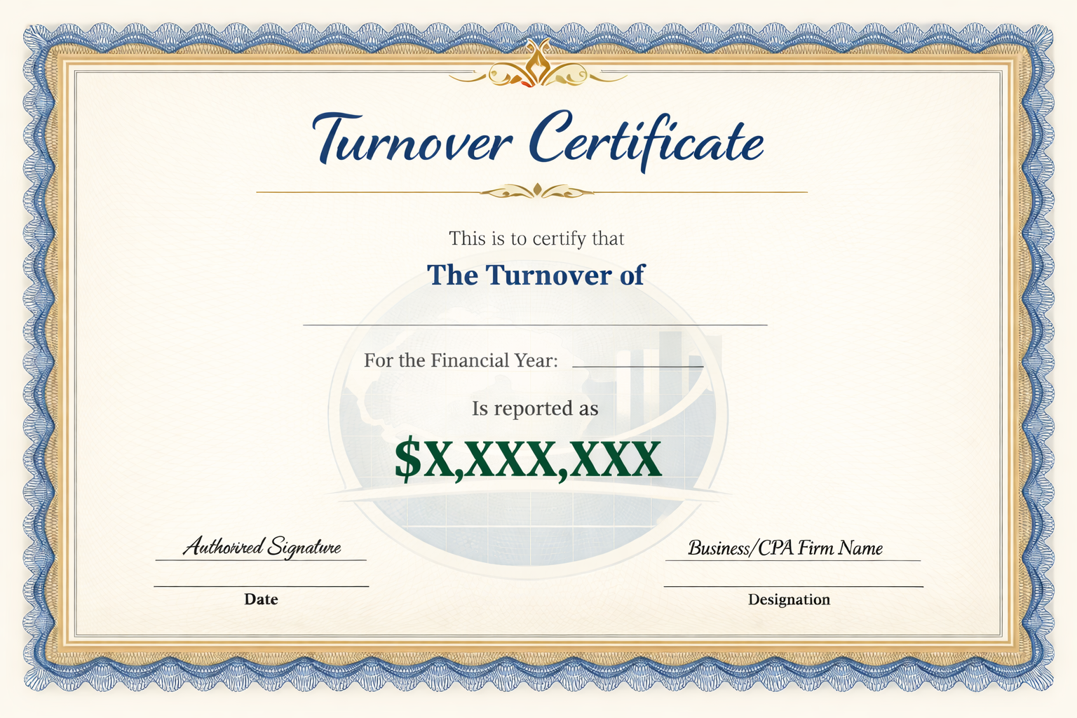 A Turnover Certificate is an official financial document that certifies the total sales or revenue of a business for a specific period. It is commonly required for bank loans, tenders, government registrations, visa applications, compliance purposes, and financial assessments.